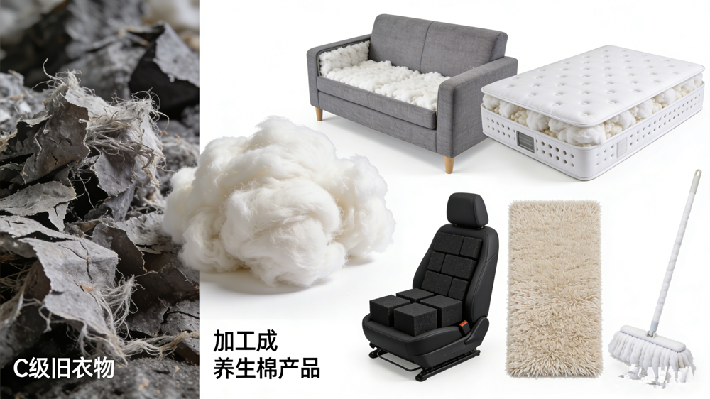 第三呢,就是C级的,C级的话会把它打碎做成再生棉,比如说大家日常用的沙发的床垫的那个汽车的座椅里面的那些黄色的棉块儿,这都是再生棉所做的,包括地毯和拖把这些文章源自旧衣客回收-https://m.zybmw.cn/13134.html
